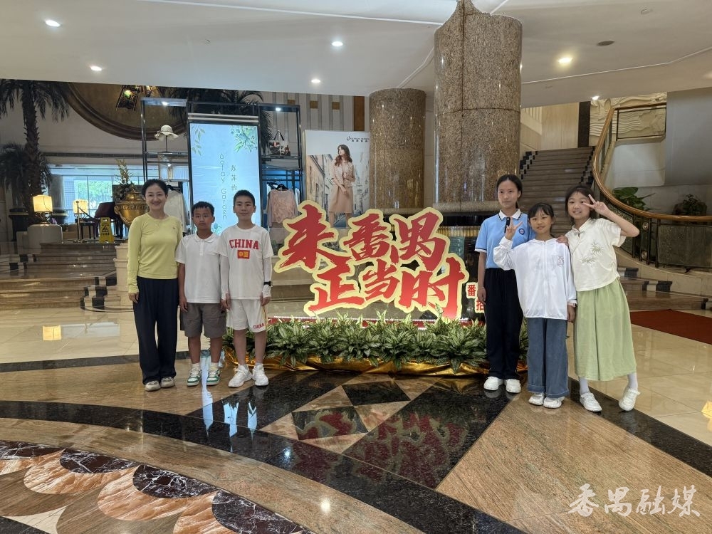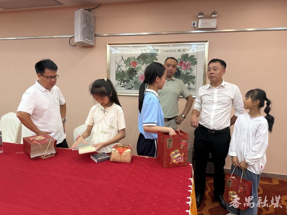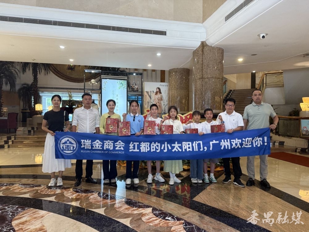 当日下午4时30分许,钟同学及同伴刚抵达番禺大厦,等候在此的广东省瑞金商会一行便送上了礼品,与同学们合影,鼓励同学们要仔细看番禺,开心游玩,用心领略番禺之美,畅享旅程。